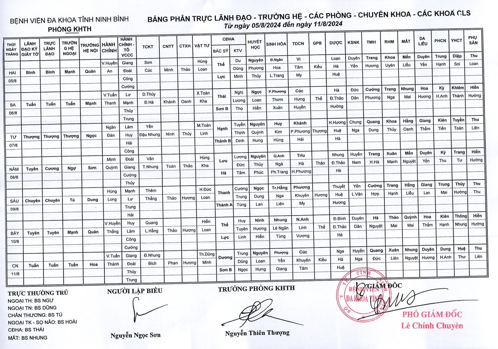 Bảng phân trực Lãnh đạo - Trưởng hệ - các phòng - Chuyên khoa - các khoa CLS (từ ngày 5 đến 11 tháng 8 năm 2024).