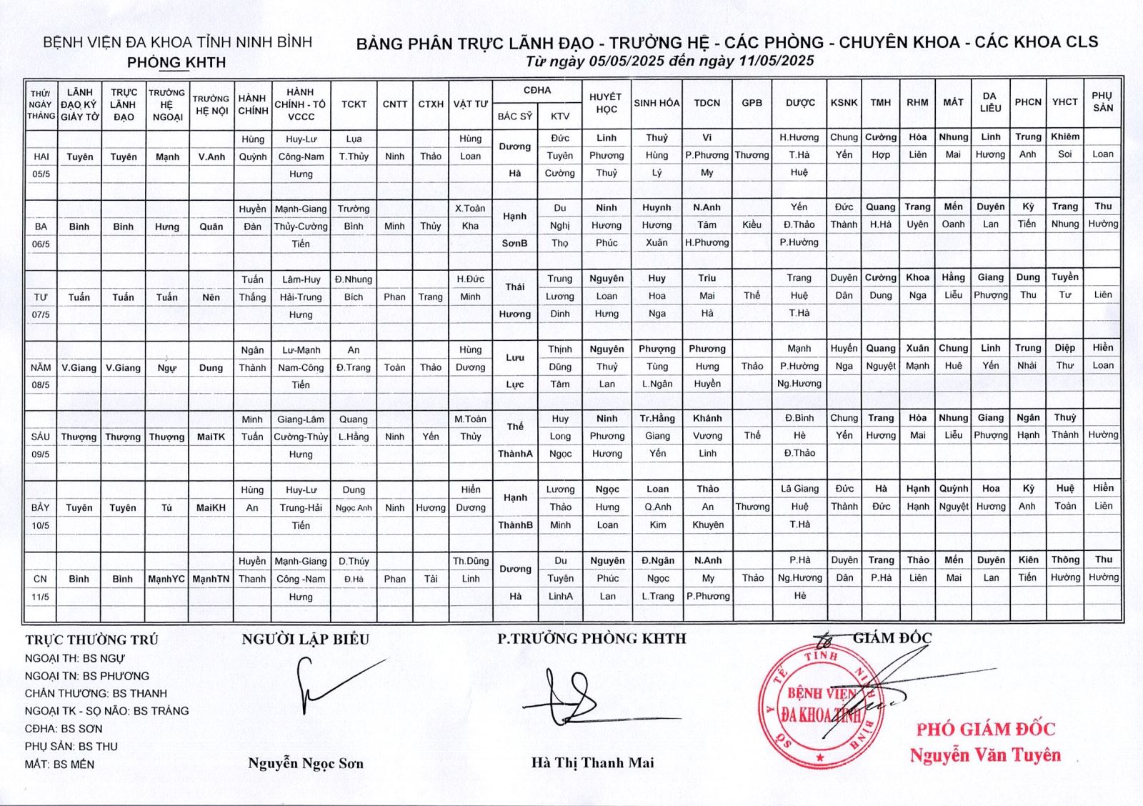 Bảng phân trực Lãnh đạo - Trưởng hệ - các phòng - Chuyên khoa - các khoa CLS (từ ngày 5 đến ngày 11 tháng 5 năm 2025).