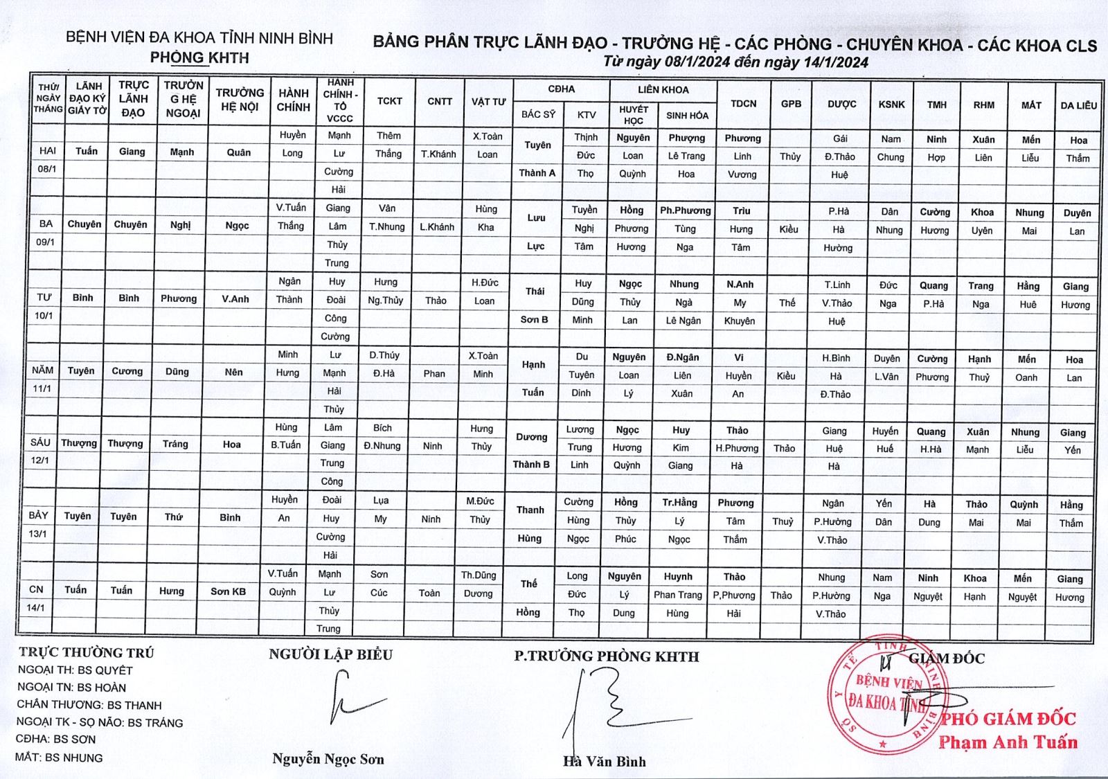 Bảng phân trực Lãnh đạo - Trưởng hệ - các phòng - Chuyên khoa - các khoa CLS (từ ngày 8 đến ngày 14 tháng 1 năm 2024).