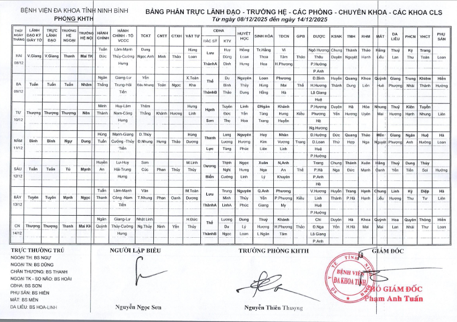 Bảng phân trực Lãnh đạo - Trưởng hệ - các phòng - Chuyên khoa - các khoa CLS (từ ngày 8 đến ngày 14 tháng 12 năm 2025).