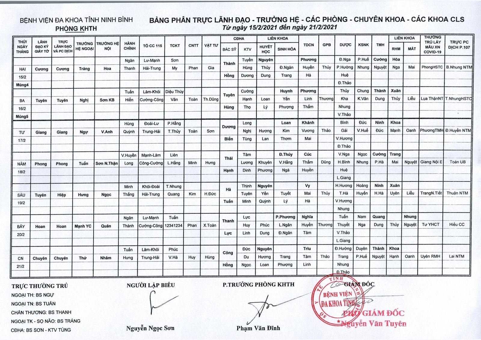Bảng phân trực Lãnh đạo - Trưởng hệ - các phòng - chuyên khoa - CLS (từ ngày 15 đến ngày 21 tháng 2 năm 2021)