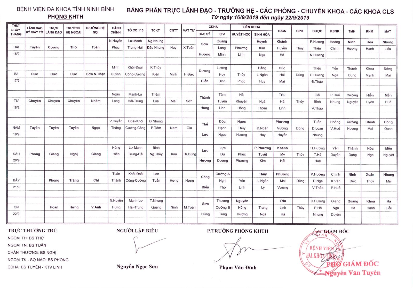 Bảng phân trưc Lãnh đạo - Trưởng hệ - các phòng - chuyên khoa - CLS (từ ngày 16 đến ngày 22 tháng 9 năm 2019)