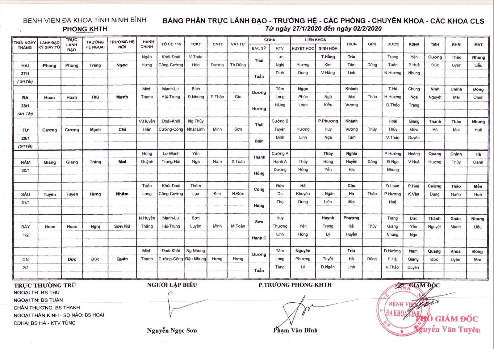 Bảng phân trưc Lãnh đạo - Trưởng hệ - các phòng - chuyên khoa - CLS (từ ngày 27 tháng 1 đến ngày 2 tháng 2 năm 2020)