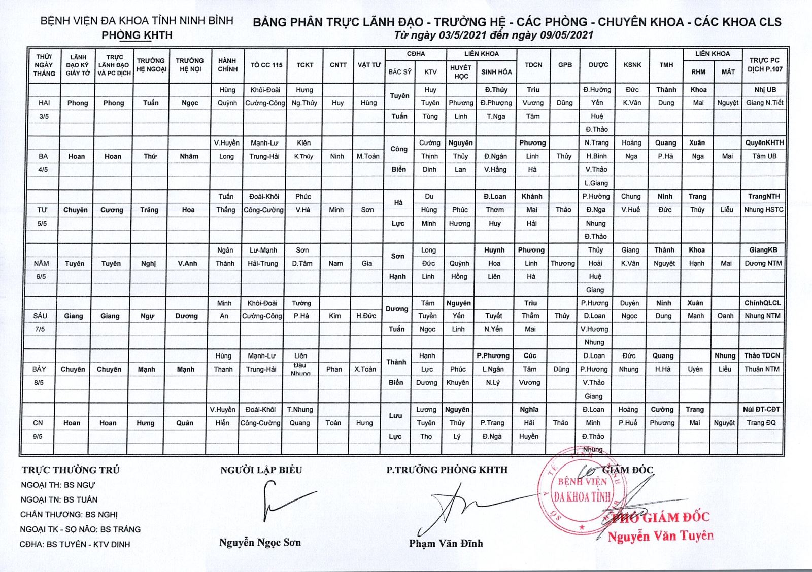 Bảng phân trực Lãnh đạo - Trưởng hệ - các phòng - chuyên khoa - CLS (từ ngày 3 đến ngày 9 tháng 5 năm 2021)