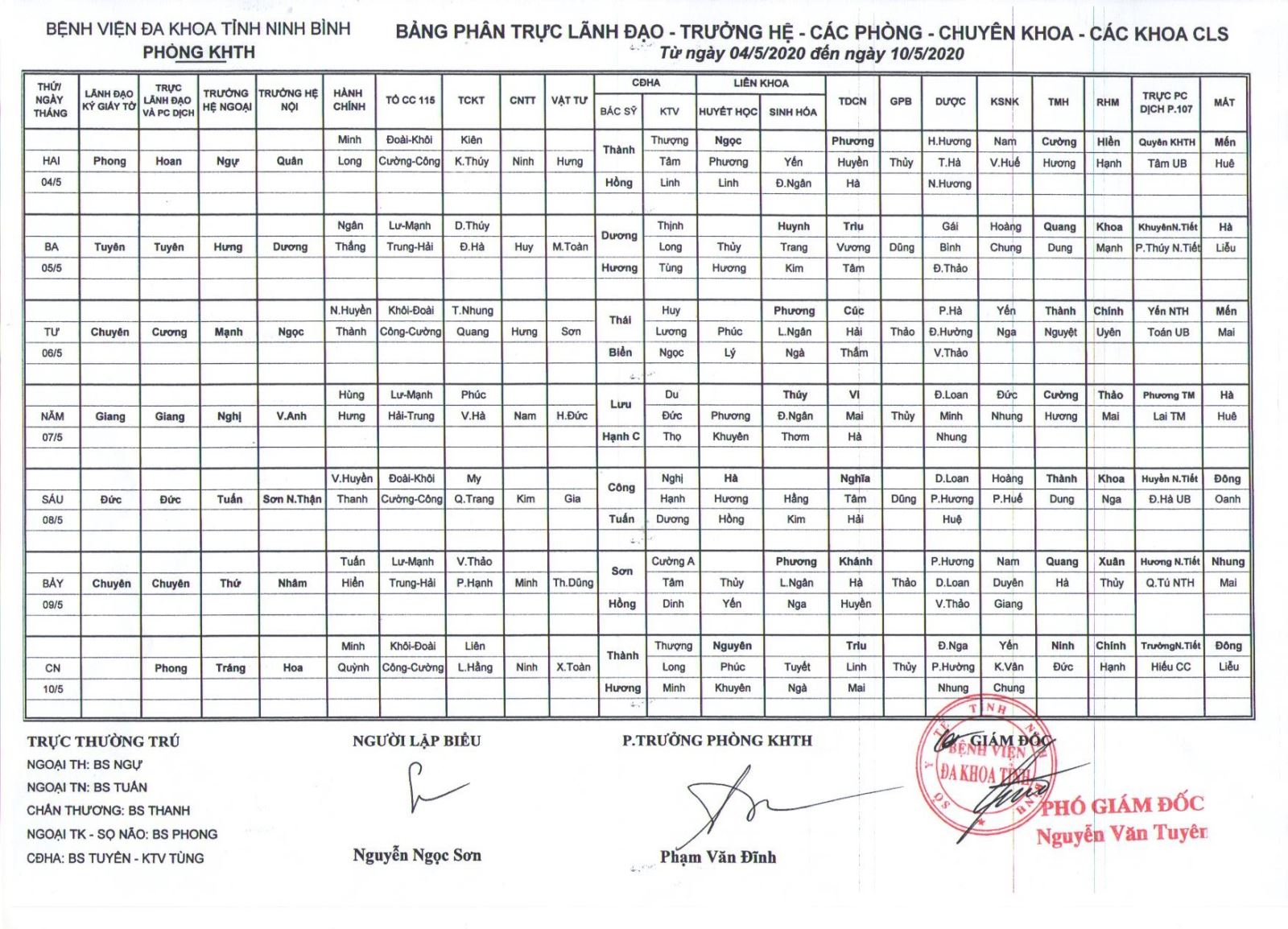 Bảng phân trưc Lãnh đạo - Trưởng hệ - các phòng - chuyên khoa - CLS (từ ngày 4 đến ngày 10 tháng 5 năm 2020)