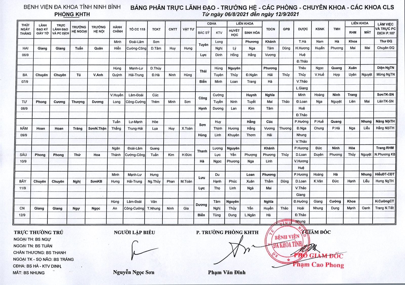 Bảng phân trực Lãnh đạo - Trưởng hệ - các phòng - chuyên khoa - CLS (từ ngày 6 đến ngày 12 tháng 9 năm 2021)