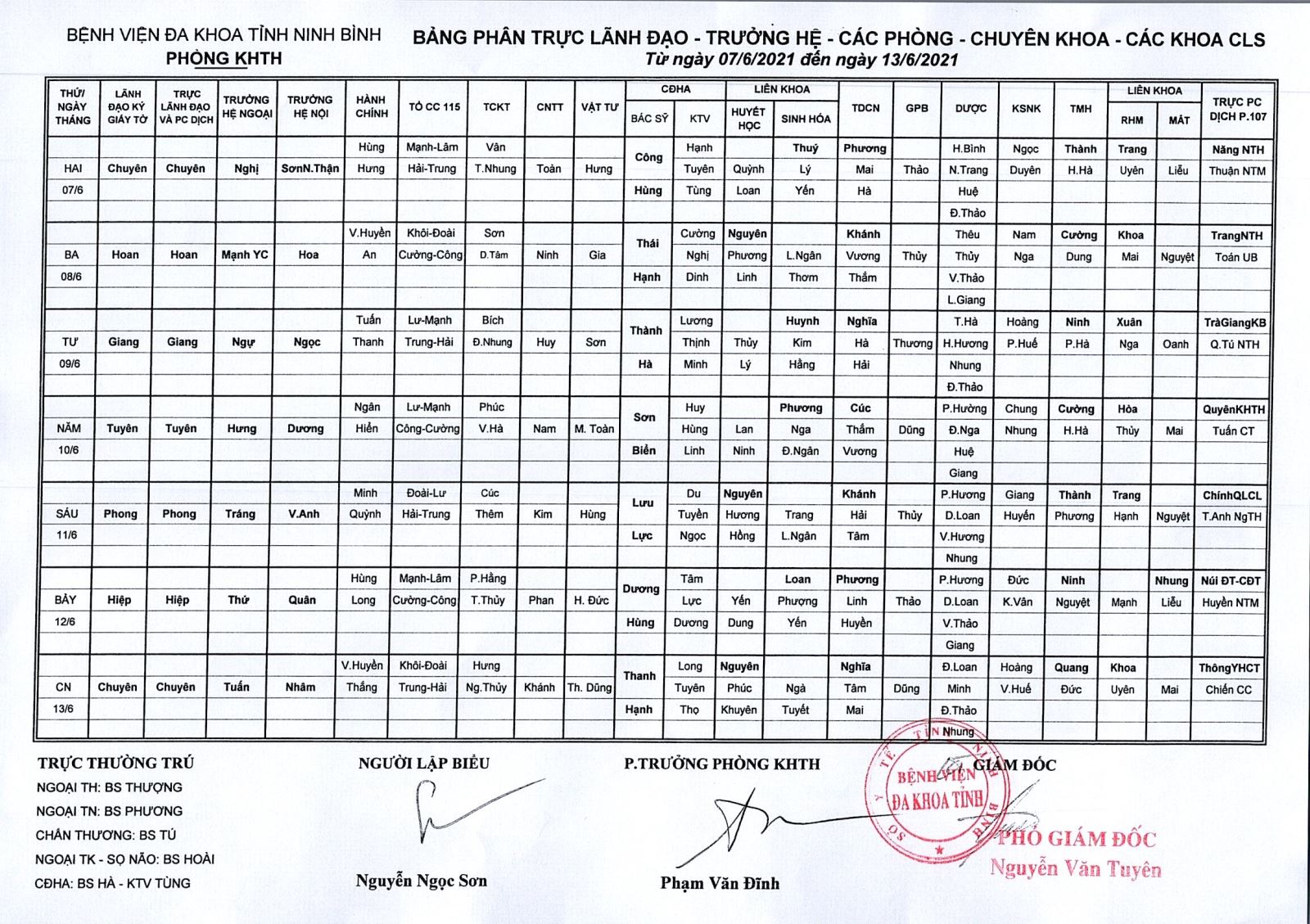 Bảng phân trực Lãnh đạo - Trưởng hệ - các phòng - chuyên khoa - CLS (từ ngày 7 đến ngày 13 tháng 6 năm 2021)