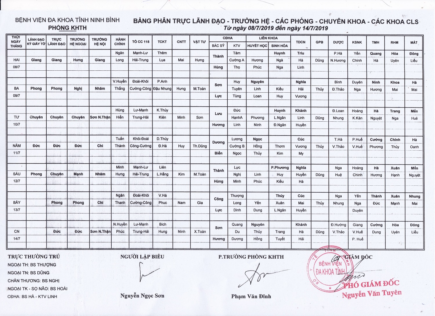 Bảng phân trưc Lãnh đạo - Trưởng hệ - các phòng - chuyên khoa - CLS (từ ngày 8 đến ngày 14 tháng 7 năm 2019)