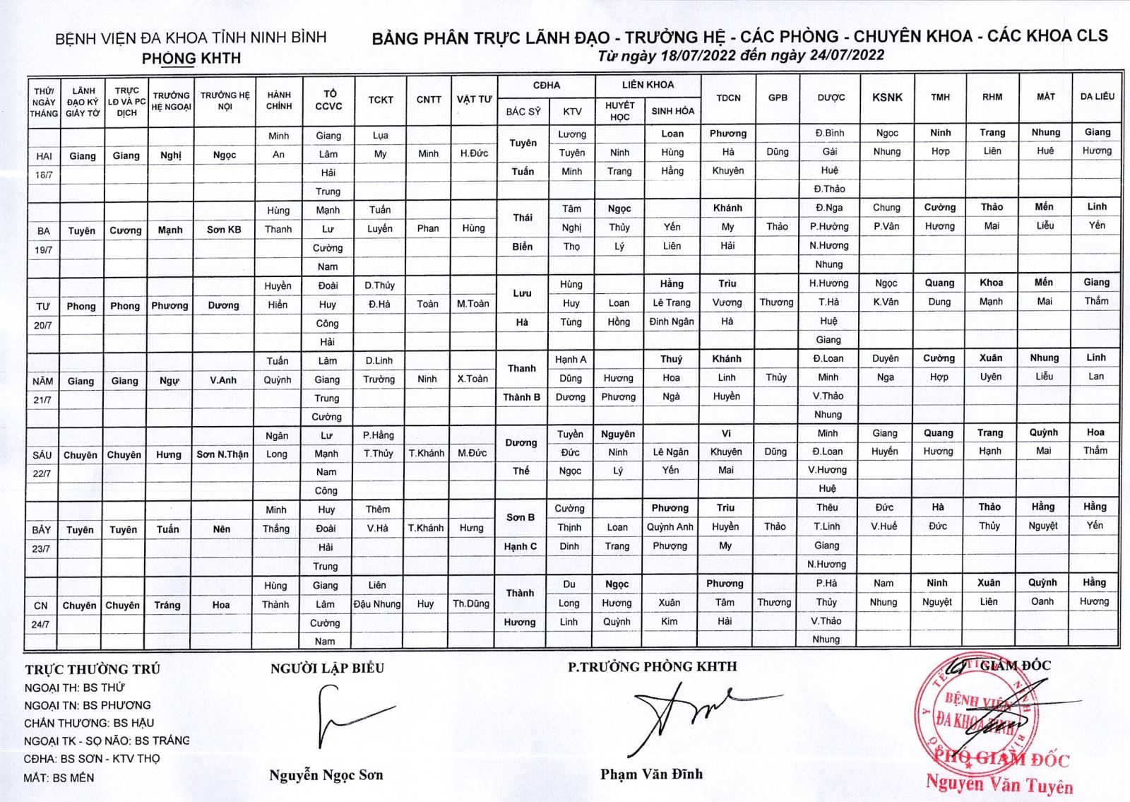 Bảng phân trực Lãnh đạo - Trưởng hệ - các phòng - đơn nguyên - các khoa CLS (từ ngày 18 đến ngày 24 tháng 7 năm 2022).