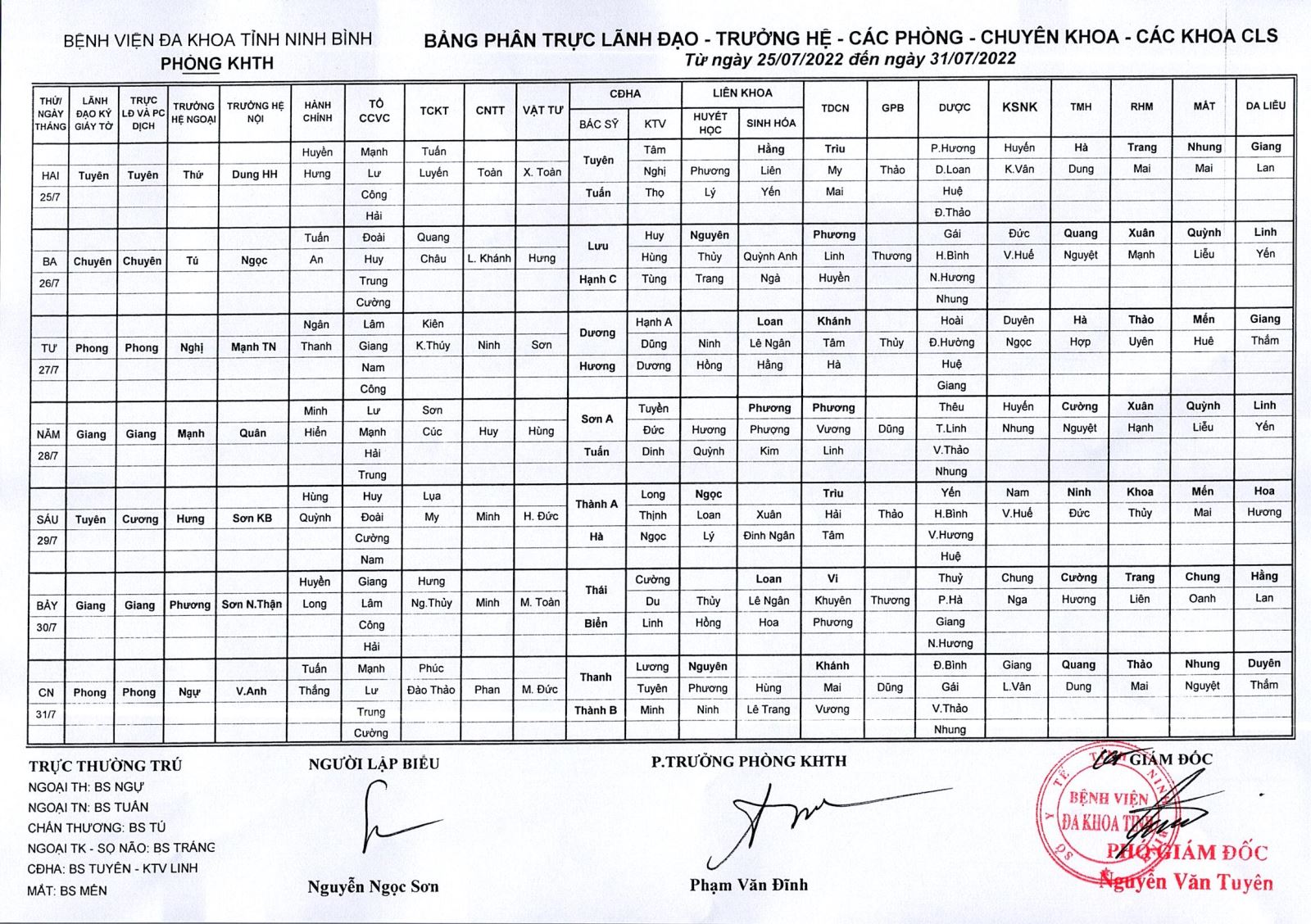 Bảng phân trực Lãnh đạo - Trưởng hệ - các phòng - đơn nguyên - các khoa CLS (từ ngày 25 đến ngày 31 tháng 7 năm 2022).