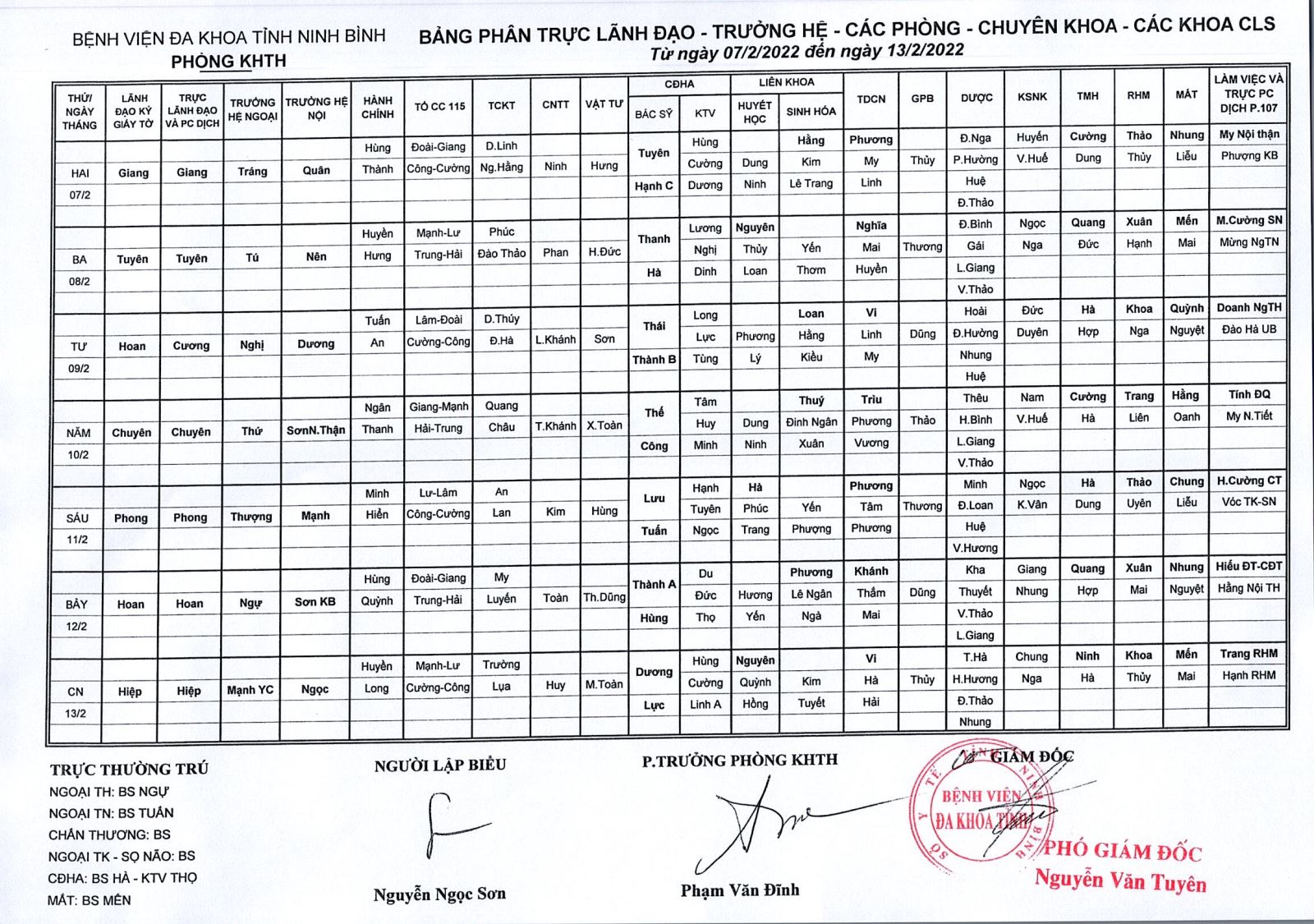 Bảng phân trực Lãnh đạo - Trưởng hệ - các phòng - đơn nguyên - các khoa CLS (từ ngày 7 đến ngày 13 tháng 2 năm 2022).