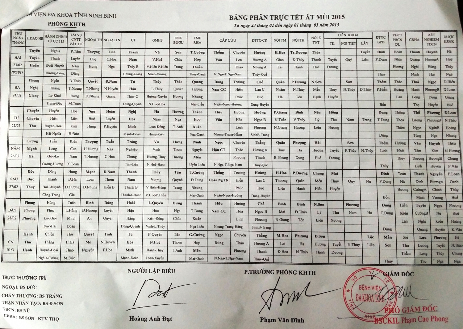 Bảng phân trực tết Ất Mùi 2015 (Từ 23/02/2015 đến 01/03/2015)