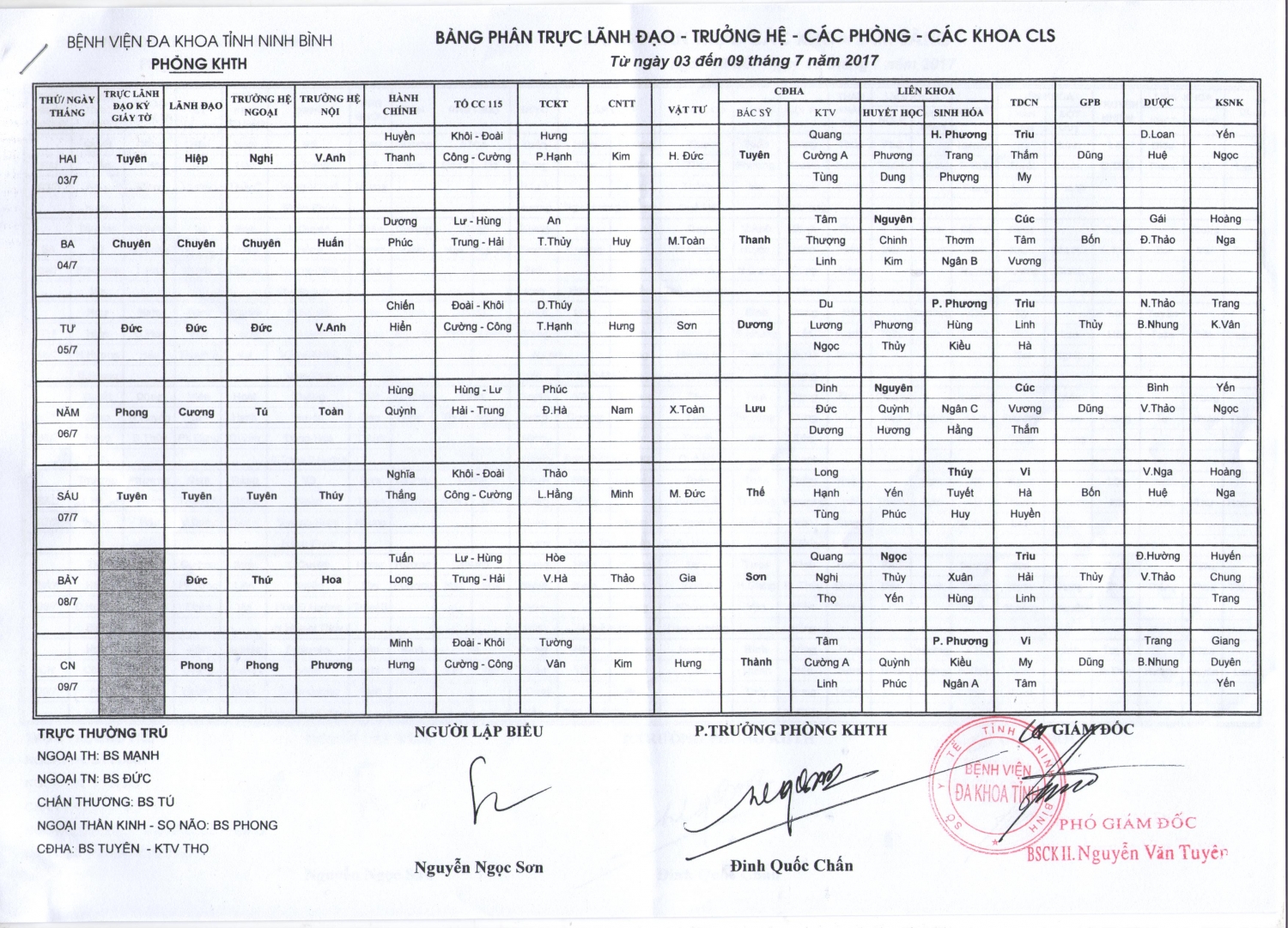 Bảng phân trựcLãnh đạo - Trưởng hệ - các phòng - các khoa CLS (từ ngày 3 đến ngày 9 tháng 7 năm 2017)