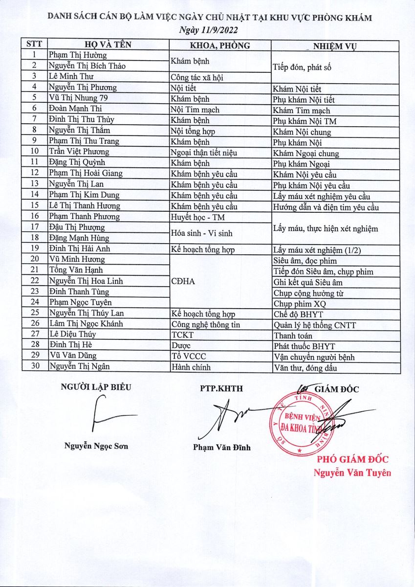 Danh sách cán bộ làm việc tại khoa Khám bệnh Chủ nhật (ngày 11/9/2022).