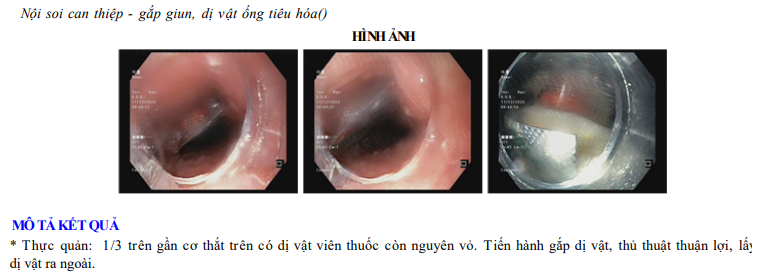 Tại khoa Thăm dò chức năng các bác sỹ đã thăm khám cho bệnh nhân qua nội soi ống tiêu hóa và phát hiện 1/3 trên thực quản gần cơ thắt trên có tổn thương dị vật dạng viên thuốc còn nguyên vỏ găm hai thành thực quản, phía trên dị vật ứ đọng nhiều dịch tiết và đờm rãi.