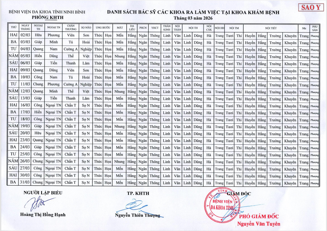 Lịch bác sỹ khám chuyên khoa tại khoa Khám bệnh Tháng 3/2026 Giờ Tiếp đón bệnh nhân: - Mùa hè: Sáng (6h30 - 11h30') Chiều (13h30' - 16h30') - Mùa đông: Sáng (7h00' - 11h30') Chiều (1h - 16h30')