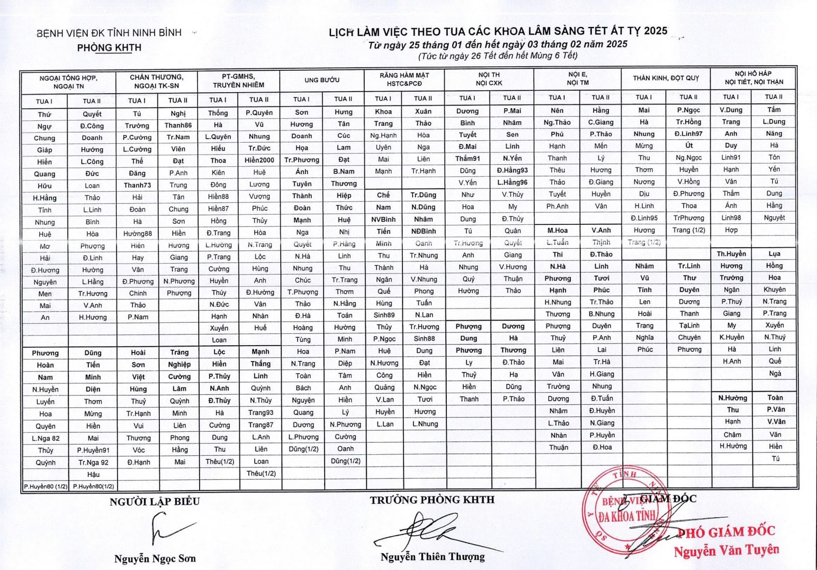 Lịch làm việc theo tua các khoa Lâm sàng Tết Ất tỵ năm 2025 (từ ngày 25 tháng 1 đến 3 tháng 2 năm 2025, tức ngày 26 Tết đến ngày 6 Tết)