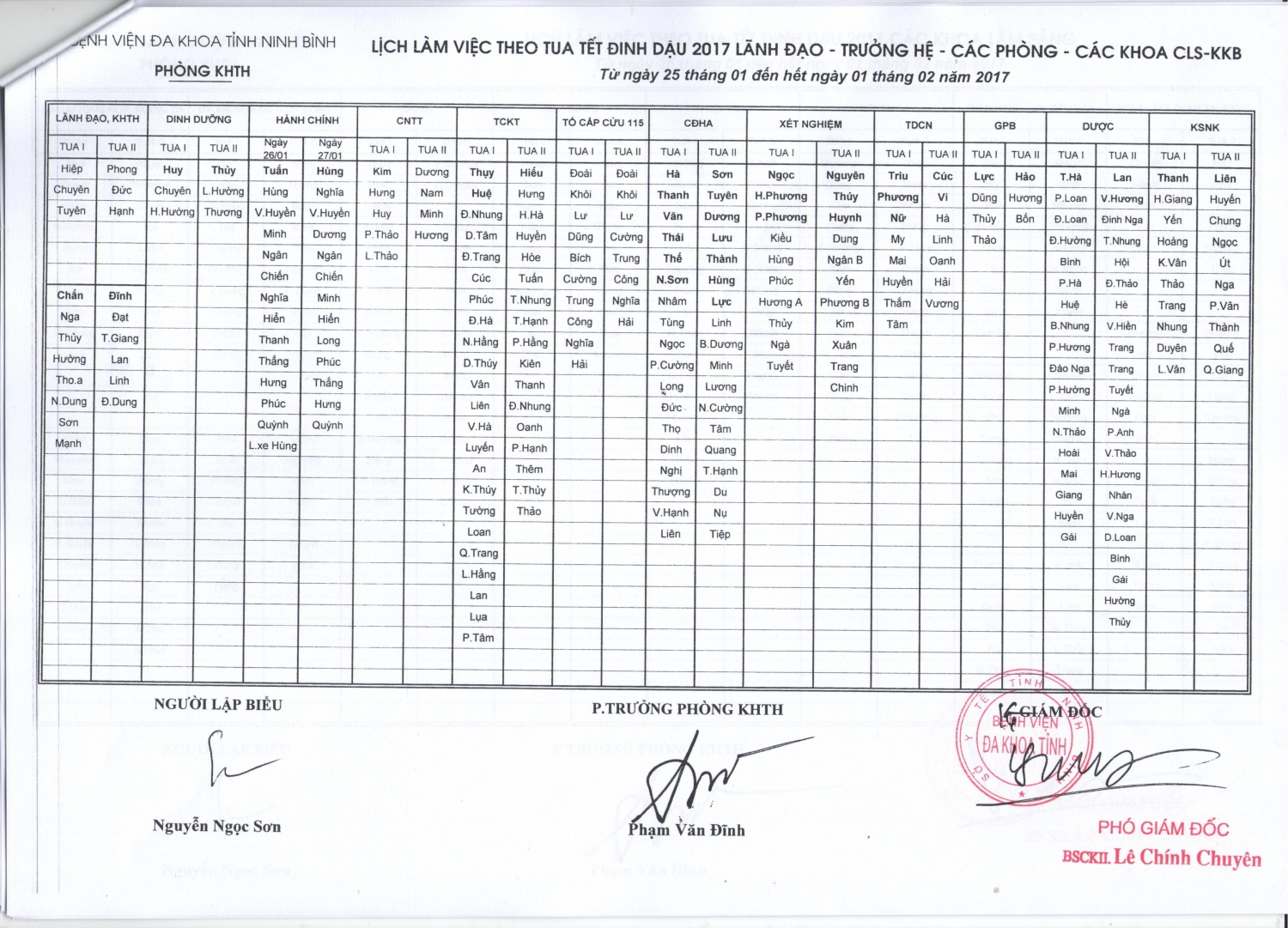 Lịch làm việc theo tua Tết Đinh Dậu Lãnh đạo - trưởng hệ - các phòng - các khoa CLS (từ 25 tháng 1 đến 1 tháng 2 năm 2017)