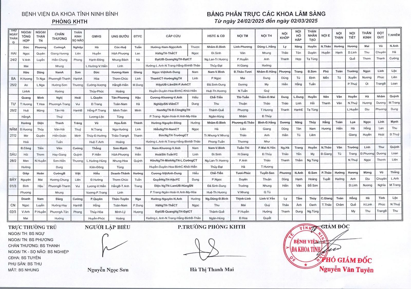 Lịch trực các khoa Lâm sàng (Từ ngày 24/02/2025 đến 02/3/2025)