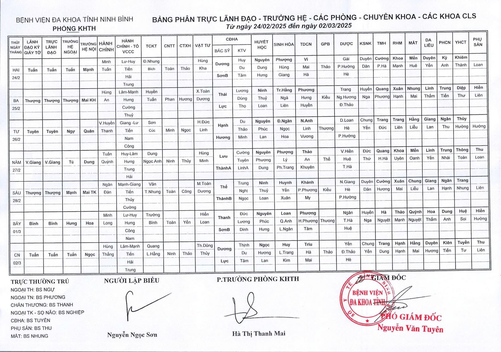 Bảng phân trực các khoa Lâm sàng (từ ngày 23 tháng 2 đến ngày 1 tháng 3 năm 2026)