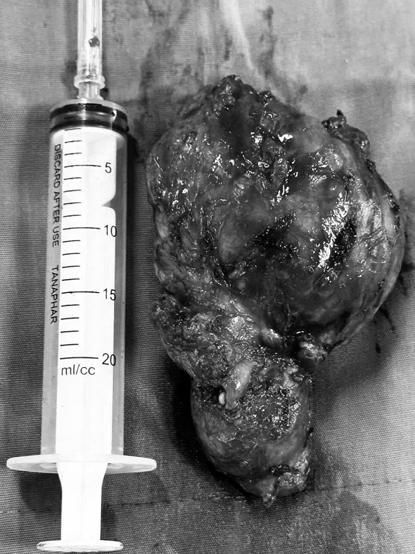 Trước khi nhập viện, bệnh nhân có tiền sử tăng huyết áp, khối u vùng cổ lớn dần gây khó thở, nuốt nghẹn, ảnh hưởng nghiêm trọng đến sinh hoạt. Qua thăm khám và chụp CT, phát hiện khối u thùy phải tuyến giáp kích thước 12x8x8cm, chèn ép khí quản và mạch máu lớn vùng cổ.
