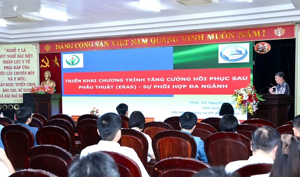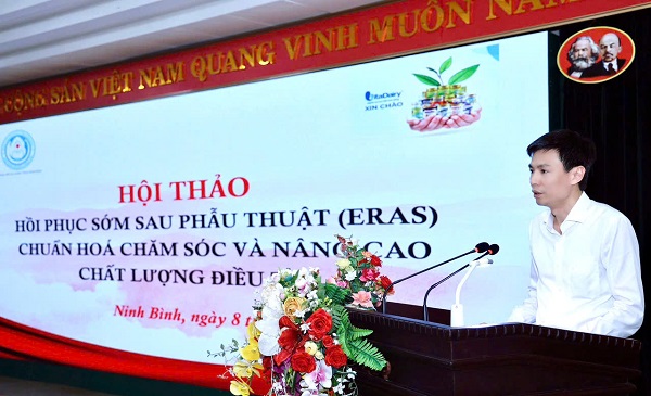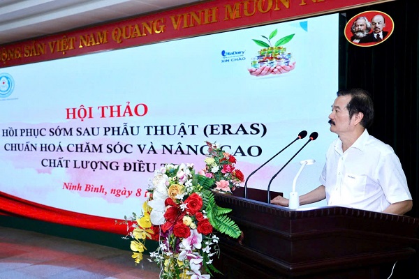 Phát biểu chào mừng tại Hội thảo, PGS.TS.Nguyễn Đức Tiến – Tổng thư ký Hội Ngoại khoa và phẫu thuật nôi soi Việt Nam đánh giá cao việc Bệnh viện Đa khoa tỉnh Ninh Bình nhanh chóng triển khai ERAS - một chương trình không dễ thực hiện nhưng rất ý nghĩa, góp phần nâng tầm chất lượng điều trị người bệnh trong giai đoạn mới theo xu hướng hội nhập quốc tế. Việc triển khai chương trình ERAS tại bệnh viện Tỉnh cũng cho thấy nỗ lực của Chi hội ERAS trong thời gian qua, nhằm lan tỏa và thúc đẩy áp dụng ERAS trên toàn quốc, góp phần nâng cao uy tín của Hội Ngoại khoa và Phẫu thuật Nội soi Việt Nam.