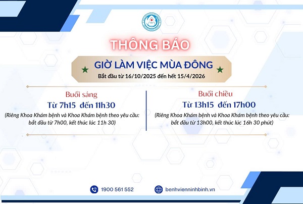 Bắt đầu từ ngày 16/10/2025 đến hết ngày 15/4/2026, Bệnh viện áp dụng giờ làm việc mùa đông.