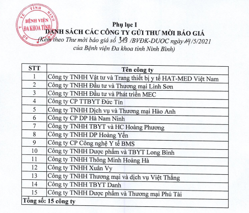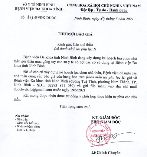 Ngày 14/5/2921, Bệnh viện Đa khoa tỉnh Ninh Bình ban hành văn bản số 319/BVĐK-DUOC về viêc mời báo giá lựa chọn nhà thầu gói thầu mua găng tay cao su y tế có bột các cỡ sử dụng tại bệnh viện.