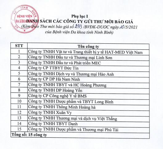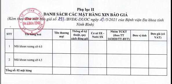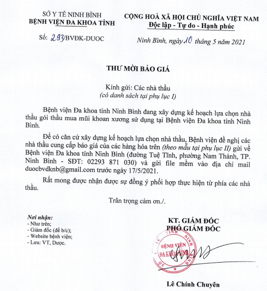 Ngày 10/5/2021, Bệnh viện Đa khoa tỉnh Ninh Bình ban hành văn bản số 293/BVĐK-DUOC về thư mời báo giá gửi các nhà thầu cung cấp báo giá gói thầu mua mũi khoan xương sử dụng tại bệnh viện.