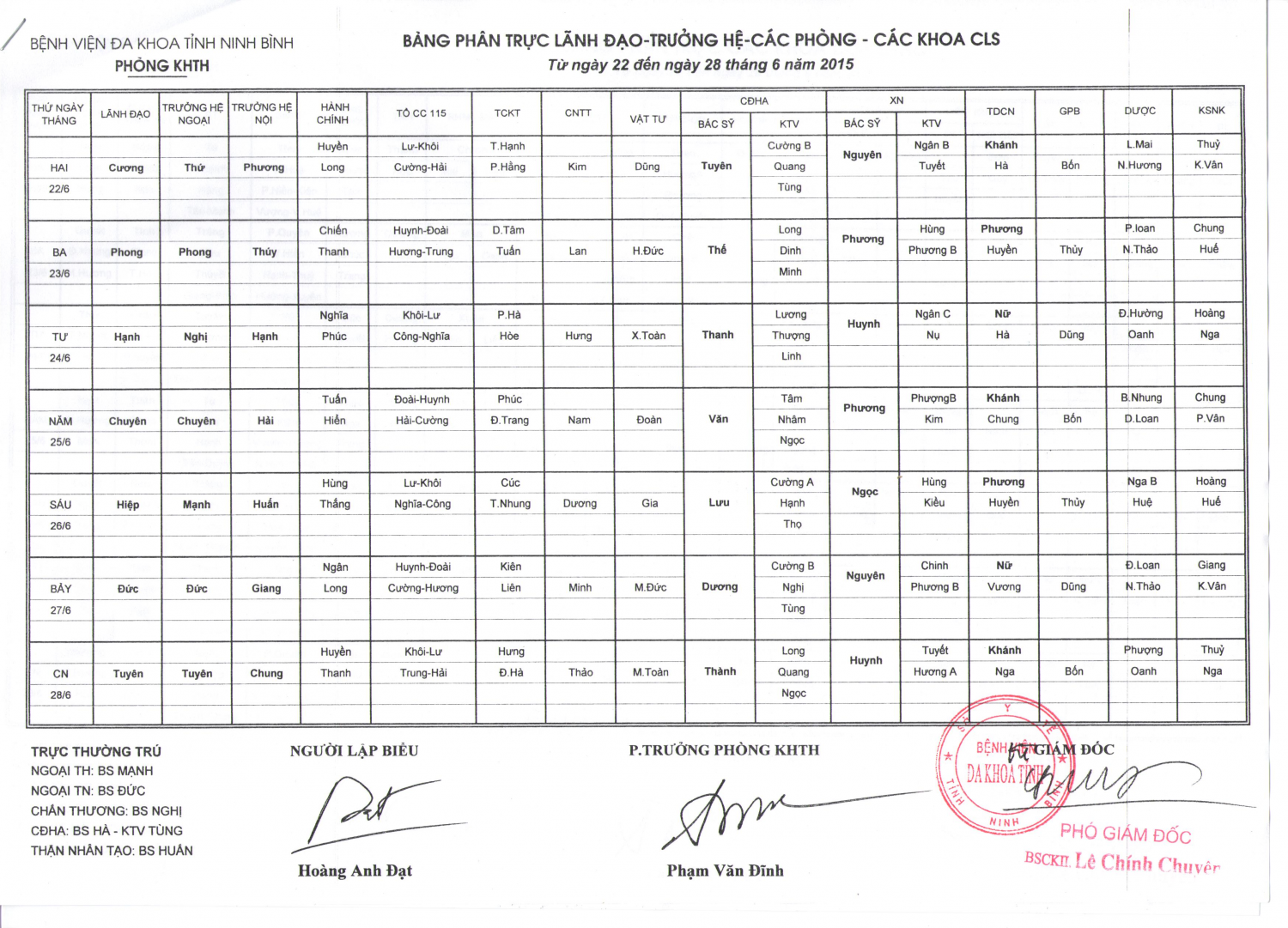 Trực từ ngày 22 đến ngày 28 tháng 6 năm 2015 (Lãnh đạo-trưởng hệ-các phòng-các khoa CLS)