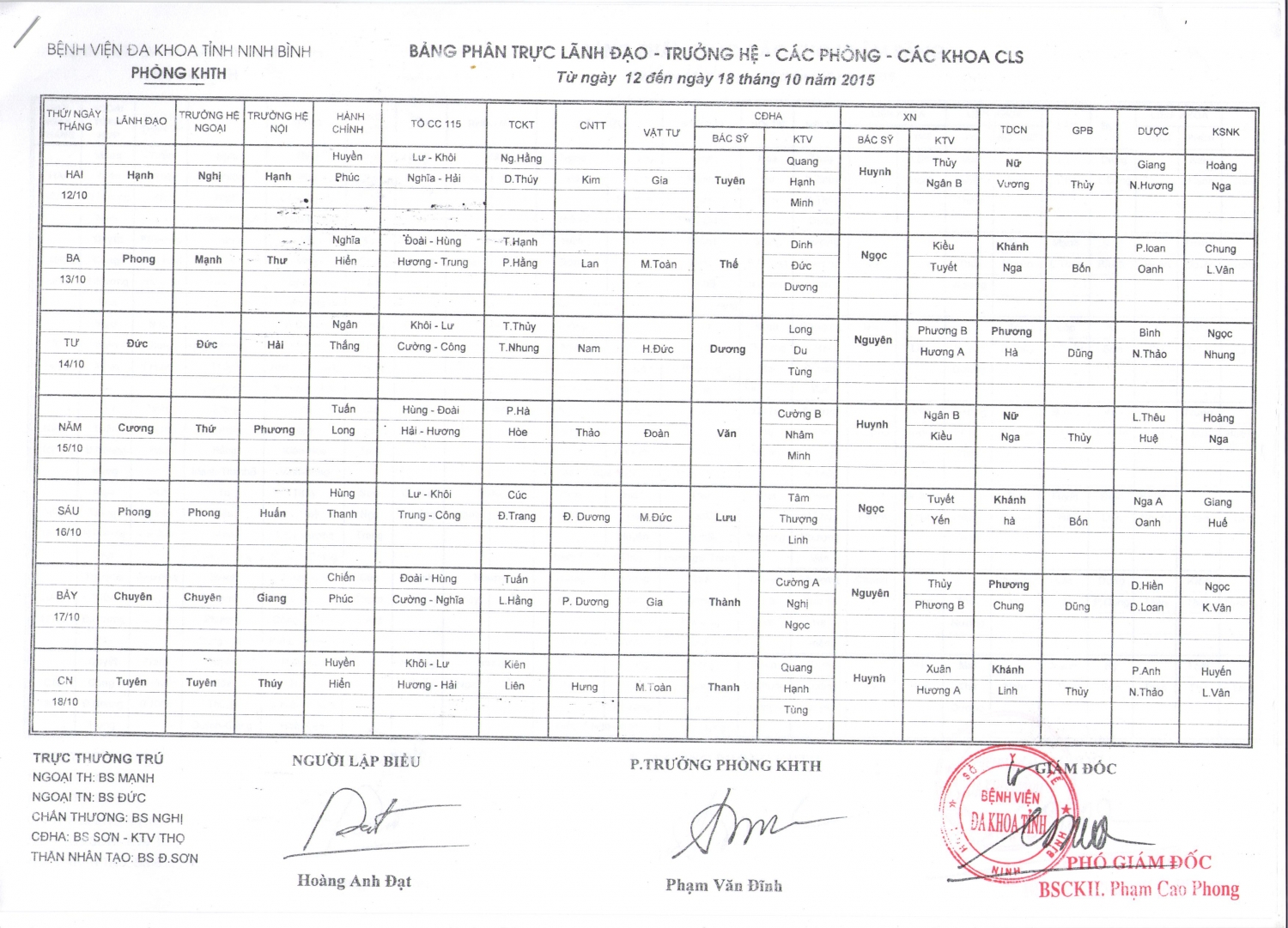 Từ ngày 12 đến ngày 18 tháng 10 năm 2015 (Lãnh đạo-Trưởng hệ-các phòng-các khoa CLS)