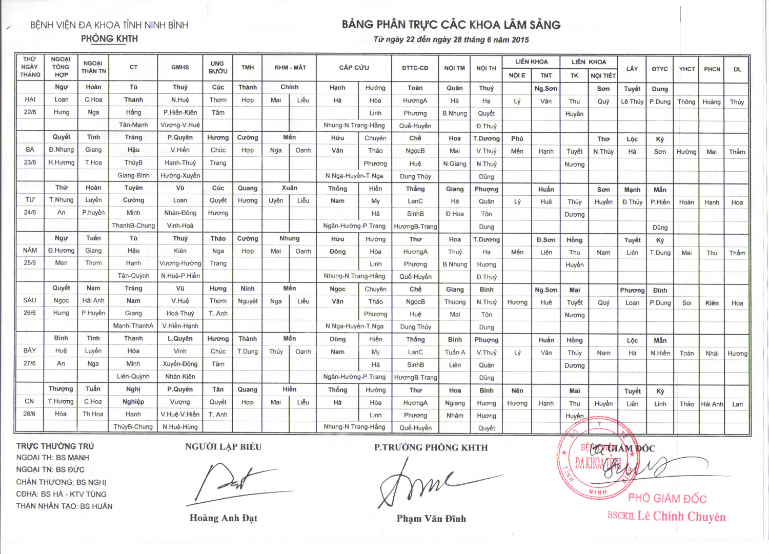 Từ ngày 22 đến ngày 28 tháng 6 năm 2015 (các khoa Lâm sàng)