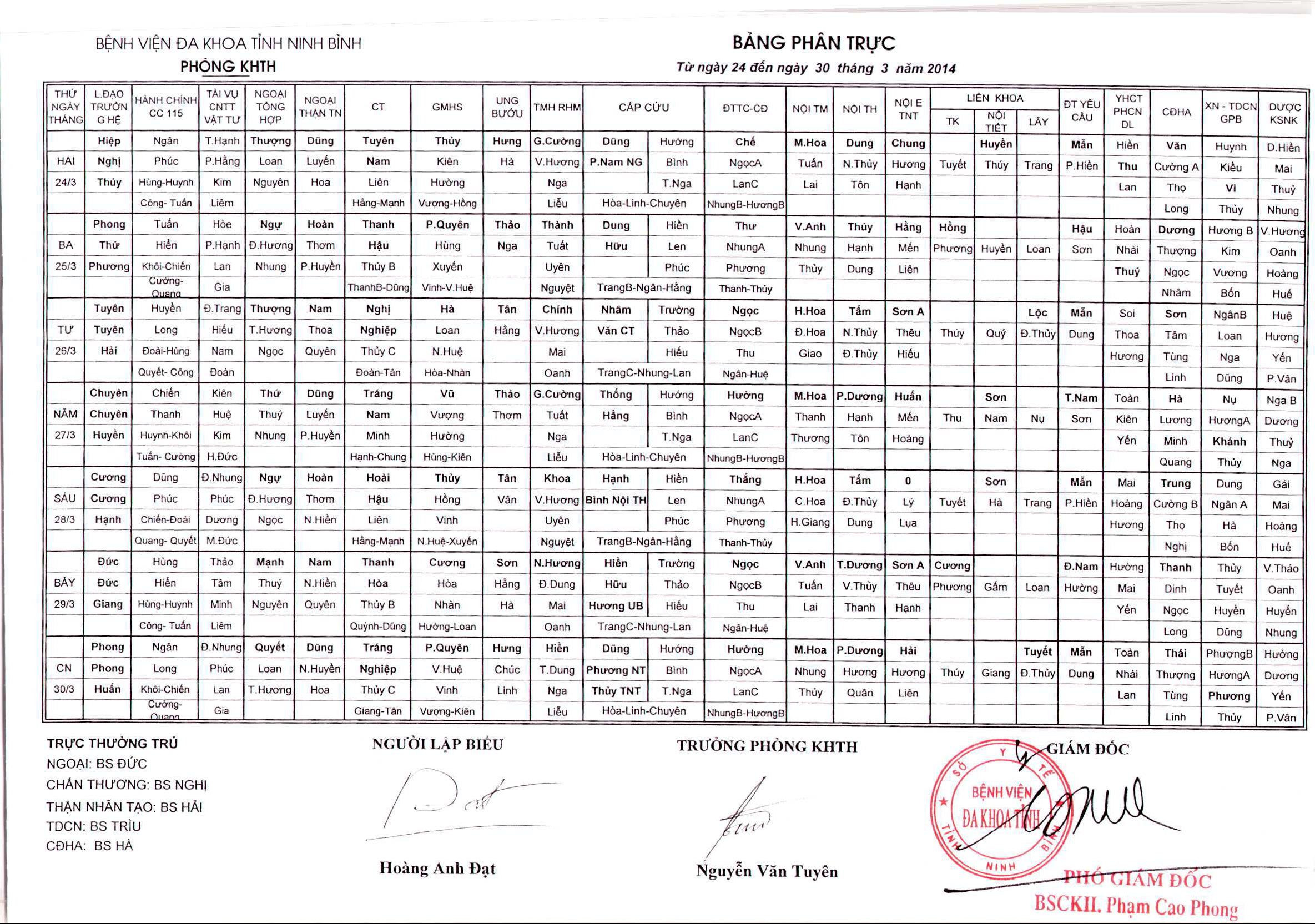 Bảng phân trực các khoa Lâm sàng (từ ngày 2 đến ngày 8 tháng 3 năm 2026).