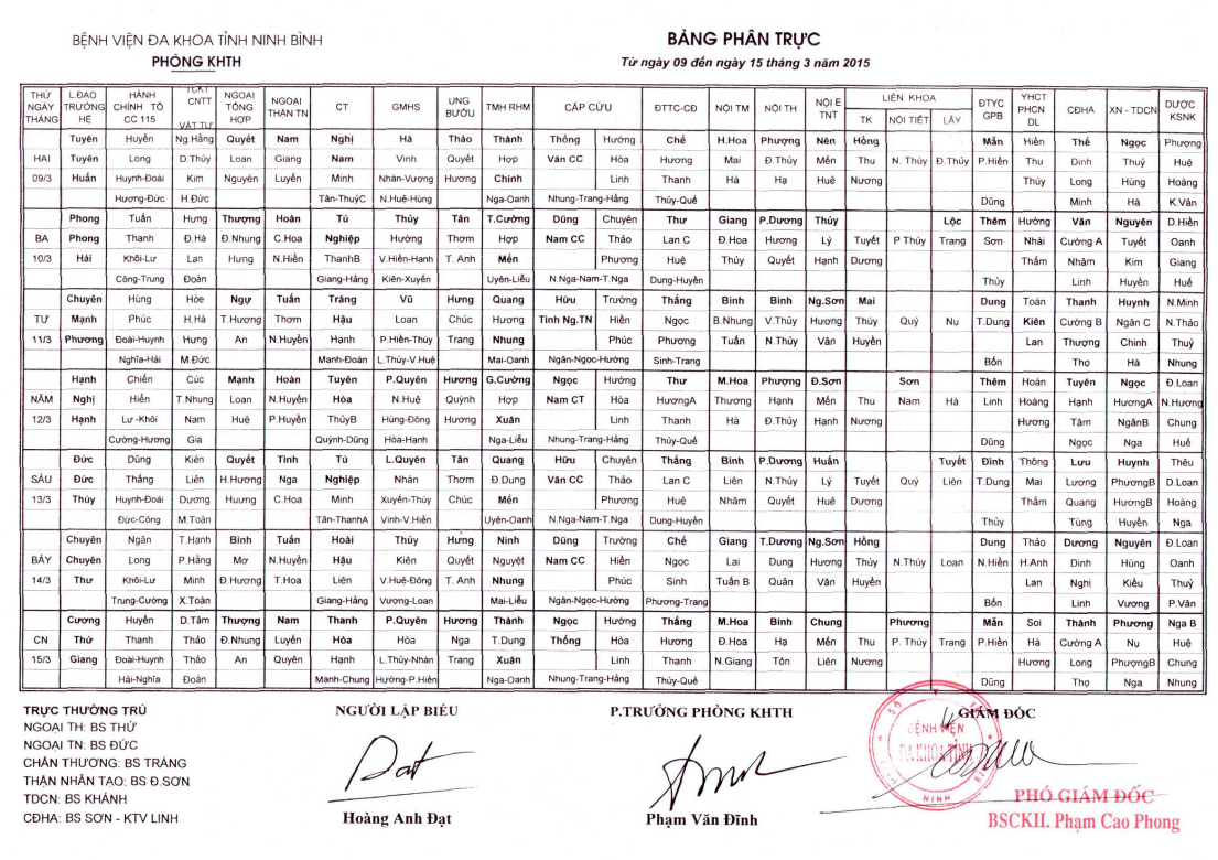 Bảng phân trực các khoa Lâm sàng (từ ngày 2 đến ngày 8 tháng 3 năm 2026).